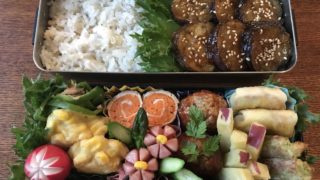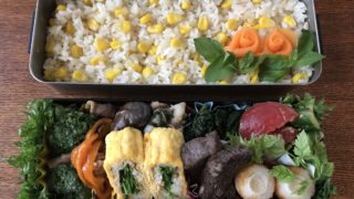 お弁当(コーンご飯③) 2018/6/18 お弁当 シェアする LINE! 息子のお弁当です♪ 🍀ブロッコリーと豚肉のオイスターソース炒め 🍀なすと豚肉の大葉味噌炒め 🍀豆苗入り卵焼き 🍀ほうれん草の胡麻和え 🍀牛肉焼き 🍀トマトとキュウリの和風サラダ 🍀ねぎちくわ 🍀もち麦入りコーンご飯 パパのお弁当です。